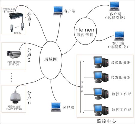 2、基于网络视频服务器、网络摄像机的网络监控模式:通过在各分点配备网络视频服务器、网络摄像机,将本地监控摄像机拍摄的模拟图像进行数字化压缩处理后,利用企业原有的局域网上传到监控中心集中管理、录像、远程回放和对讲,联网的客户端电脑可以实时监控相关图像,也可以随时访问录像主机调用历史录像数据回放显示。