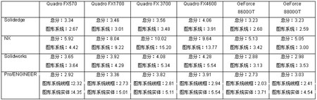 从运行成绩上看,Quadro FX4600作为高端的专业显卡取得了大多数测试项目的胜利,但是它相对于2008年刚刚发布的Quadro FX 3700而言,优势并不明显。在EnSight、Maya、SolidWorks、UGS NX 和UGS Teamcenter Visualization Mockup这些强调实时光源和材质渲染的测试中,Quadro FX4600相比中端和入门级的Quadro FX1700、Quadro FX570则大幅度领先,体现出其高端产品的价值。而唯一一片2008年上市的Quadro FX 3700则不负众望,性能非常抢眼。