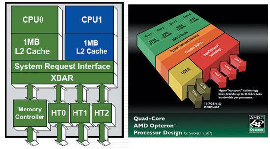 首先,我们知道AMD引以为荣的点对点处理器互联架构是其一大法宝,这个架构的基础就是AMD主导开发的开放式点对点总线技术HyperTransport,简称HT。从早前的第三代65nm Opteron(即Barcelona,巴塞罗那)的介绍中,我们可以看出它就已经采用了3条HT总线的设计,而在这一点在“上海”身上并没有变化,可是在一些规格上却有了不同