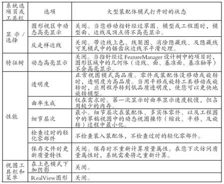 SolidWorks对于大装配体设计作了大量的优化。通过使用选项中的“大装配体选项”就可以优化软件的系统设置,提高大装配体的性能。当大型装配体模式打开时,以下选项在其各自系统选项页或工具栏中不可使用(变为灰色),并且如表2所述自动设定。当大型装配体模式关闭时,选项返回到其先前设定。
