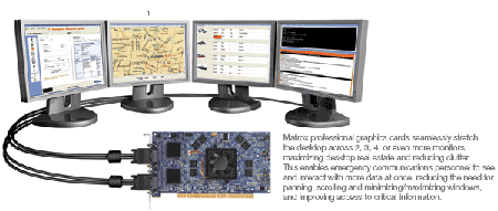 除此以外,matrox为支持apple的30寸高分辨液晶显示器而推出的另一款卡DL256能提供2560x1600分辨率(400万像素)的显示方案为空管领域应用提供了一个廉价高性能的解决方案。此方案对于ATM(Air Traffic Management,空中交通管理)也非常有意义,对于航班计划、管理、控制人员来说,管理更大量的信息有利于工作效率的提高。