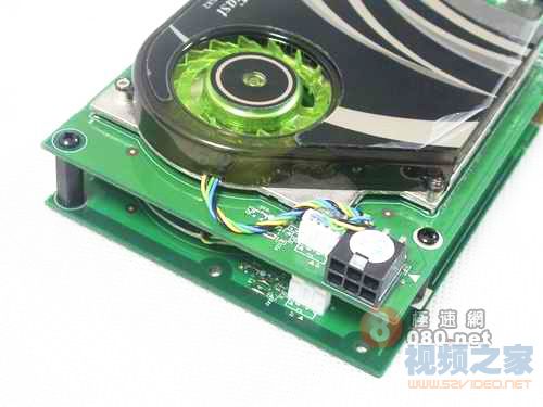 显卡使用的是6pin的辅助供电接口,我们看到这个接口也被设计在了上方的PCB上,也就是P602上。事实证明,7950GX2的功耗还是相当惊人的,特别是在组建了Quad SLi以后,我们使用了两个电源才将它搞定,一个是航嘉的磐石500,另一个是Tt的520W电源,在完成这样的搭配后,我们也终于可以稳定地运行自己的Quad SLi系统了。