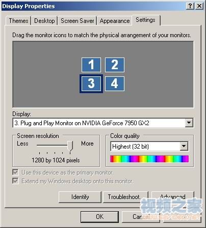 如图,这是我们在刚才的四屏显示模式下,在显示属性中对4个显示器的设定,此时在驱动程序中对应的设定如下: