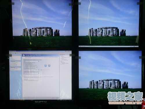 不知道此时应该高兴还是沮丧。我们终于能够通过4个屏幕来显示一个完整的画面内容了,不过此时我们也发现,这和我们所看到过的真正意义上的四屏显示还不完全一样。尽管窗口可以在屏幕上拖动并且能够做到分别在几个屏幕上进行显示,但是桌面的墙纸并不是完整的一块,却是和并行显示一样在4个屏幕上分别显示了完整的墙纸;另外系统的任务栏也并没有扩展开来,而是仍然集中在了一个屏幕上。尽管单个的非最大化窗口能够在屏幕之间拖动,但是窗口最大化时并不是占据所有屏幕,而只是集中在了其中的一个上。看来,这个4屏的显示并不完美,是我们设置上有问题吗?为了能够找到原因,我们决定再进显卡的驱动去看看。