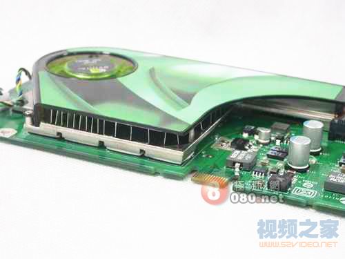 我们现在来看看7950GX2的散热器部分,由于是要将两块卡叠合在一起,显卡的散热器肯定没有办法做的很厚,因此在看到略显单薄的单卡槽散热系统后,我们也并不惊讶。上下两块卡使用的散热器是相同的。散热器的主体材料仍然是采用了铝片,不过核心部分散热使用的是镶铜。散热片的设计是一种比较折叠式的架构,从照片中来看,似乎这种折叠并不是非常平均,不过由于散热器设计的比较大,它还是做到了覆盖核心和显存这两个重点需要散热的部分此外,显卡使用的是由风扇抽风,通过散热片向外排出的风道设计,从外部接口旁的风道口我们可以大致判断出显卡对散热的处理方式。总的来说,我们对7950GX2的散热系统并不十分满意,过于简单的设计让我们怀疑它能否保证显卡在超频状态下满足核心及显存的散热需求。不过本次的测试重点并不在此,而事实上我们相信除了一些骨灰级发烧友,没有多少人还会不满足于这块卡本身的性能的。