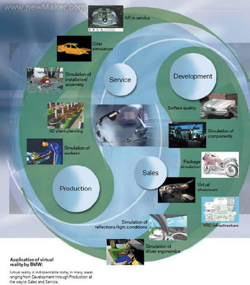 正如许多部门运作的一些较小的虚拟现实视觉系统,宝马虚拟现实技术中心提供了一系列完整的不同方案:设计师评估特定部件的尺寸,总装部工程师从投影墙来检查他们如何利用汽车内部甚至最后一毫米的空间,人类的空间需求在汽车的内部空间模拟中应该特别重视的。坐在虚拟车中,人们可以测试驾驶舱的最佳布置,人们能否在各种光照条件下很方便地阅读(或者他们是否可能对光线的反应)。发动机部门的专家可以在一个平台上进行的交互仿真过程中检测出发动机中的薄弱点,而发动机本身仅是以一组数据形式存在。声学专家最后利用数字化的汽车模型在虚拟风洞中进行震荡和空气动力学试验,力求最小风阻系数的情况下优化汽车的造型和设计。